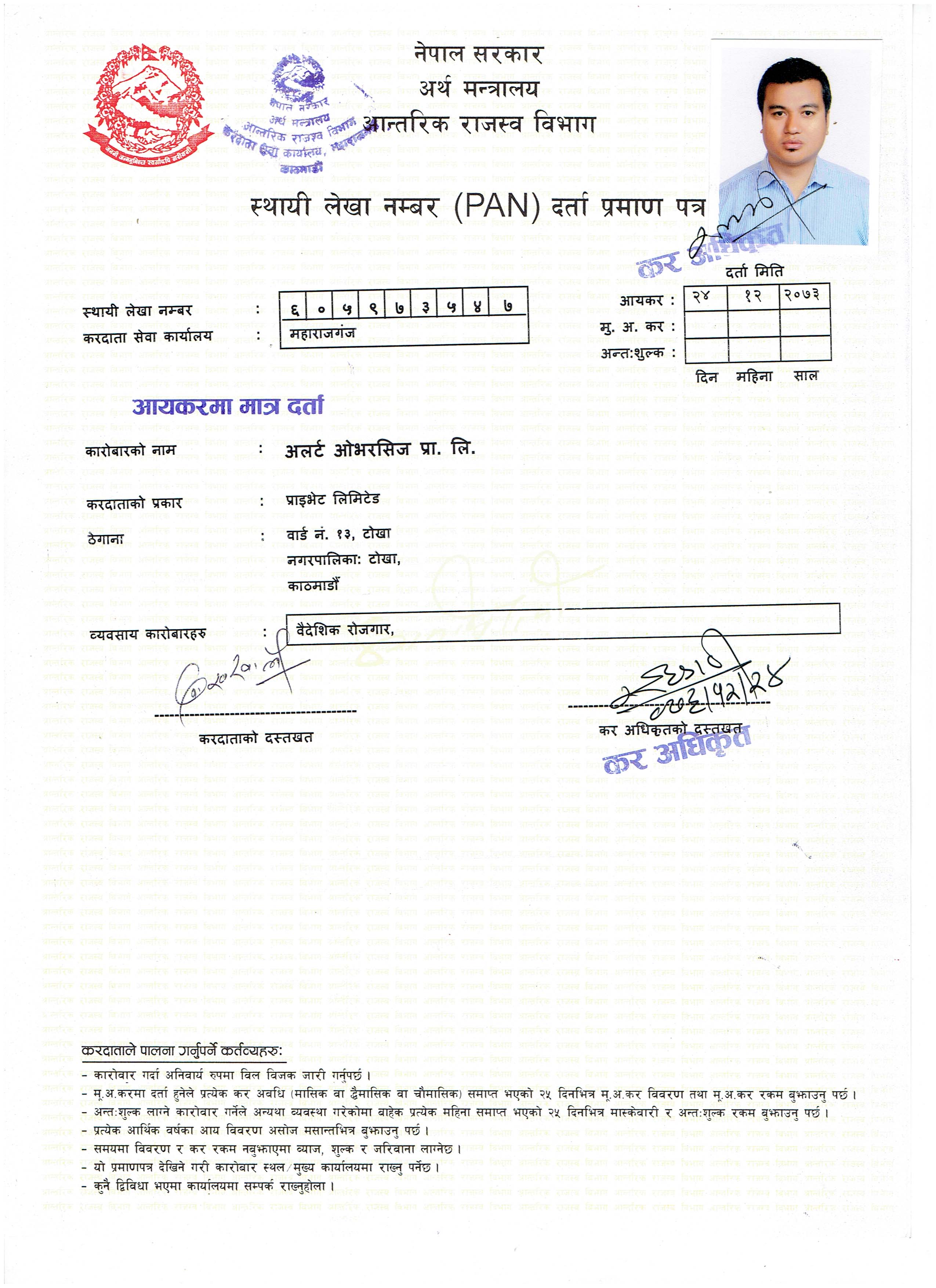 Permanent accounts number (PAN) Registration Certificate